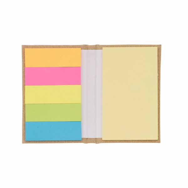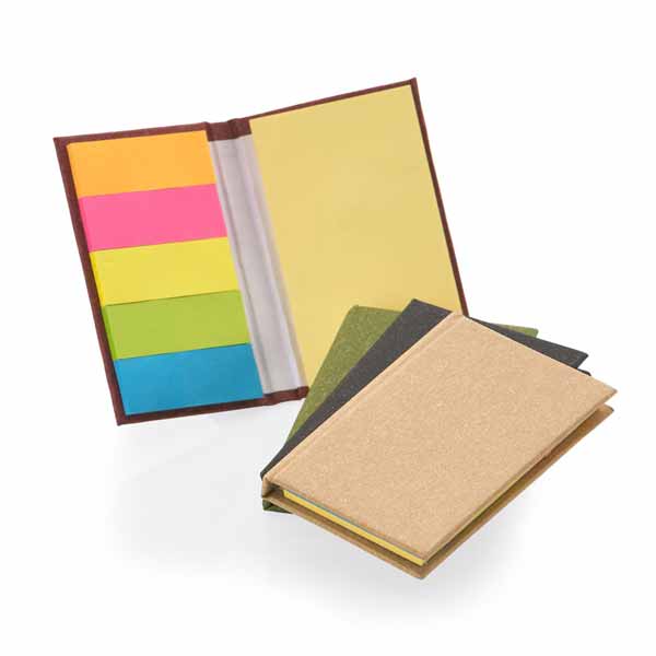 Bloco de anotações com capa dura, stiky notes e miolo sem pauta na cor amarela.
