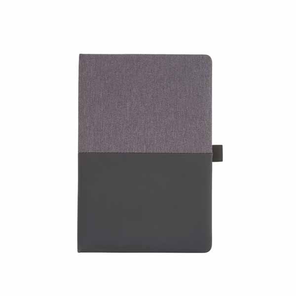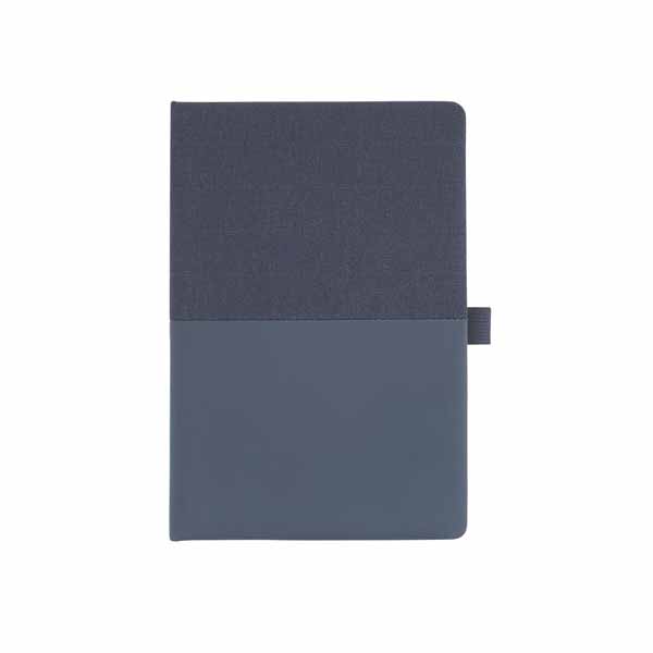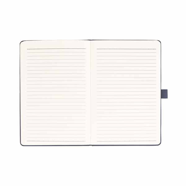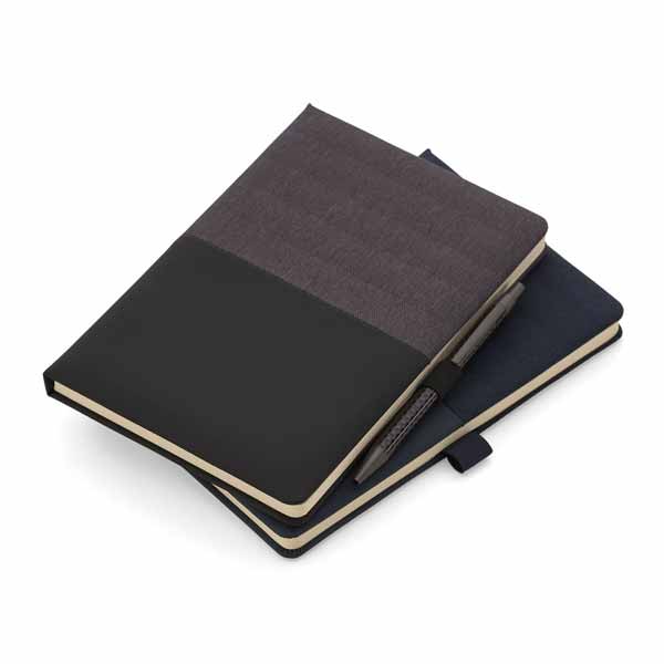 Caderno de anotações com suporte para caneta, capa dura almofadada em material sintético, miolo 80 folhas pautadas na cor bege.