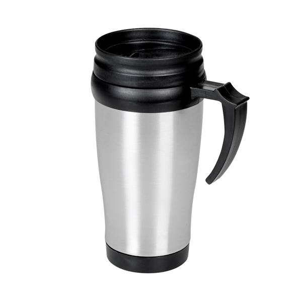 Descrição: Caneca inox de 400ml revestida internamente com PVC, pegador e detalhes em plástico resistente. Tampa rosqueável, possui compartimento que pode ser aberto para beber(não é térmica).