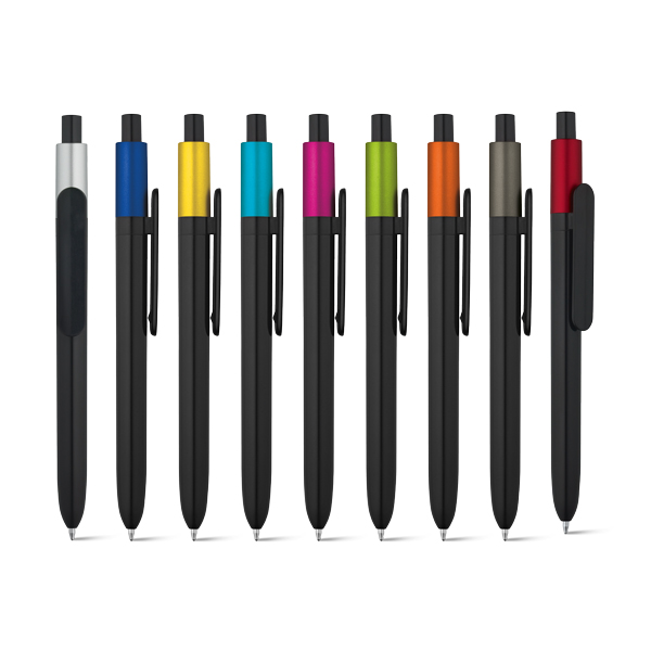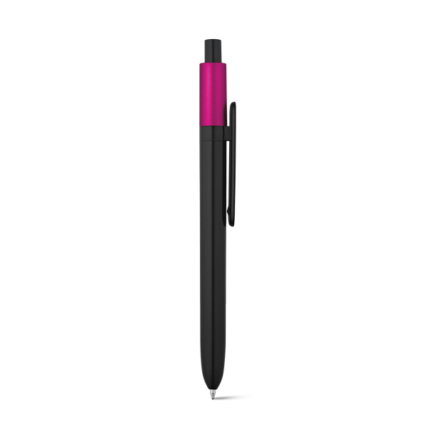 Esferográfica em ABS com acabamento brilhante e topo laqueado com acabamento metalizado. Recarga X20. Tinta azul.