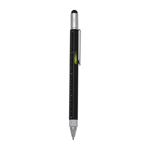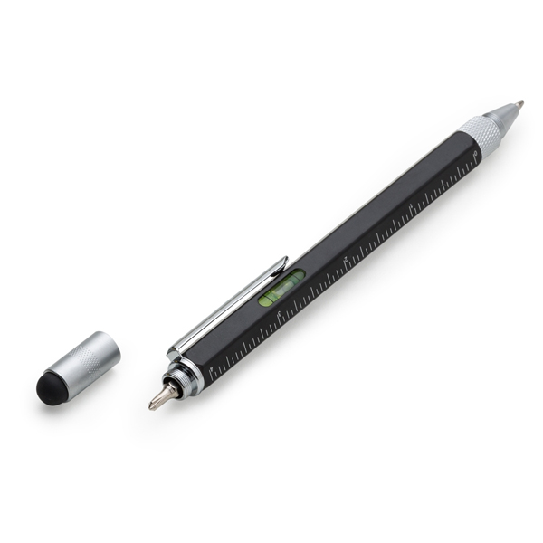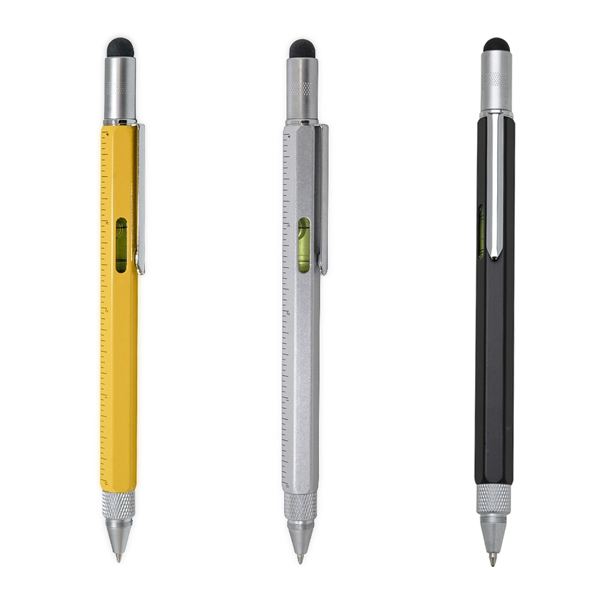 Descrição: Caneta de metal com paquímetro inteira colorida com detalhes prata. Possui ponteira touch e ao desroquear compartimento prata que sustenta o touch, há uma chave Philips. Clip de metal, possui nível e também é esferográfica, basta girar para acionar..