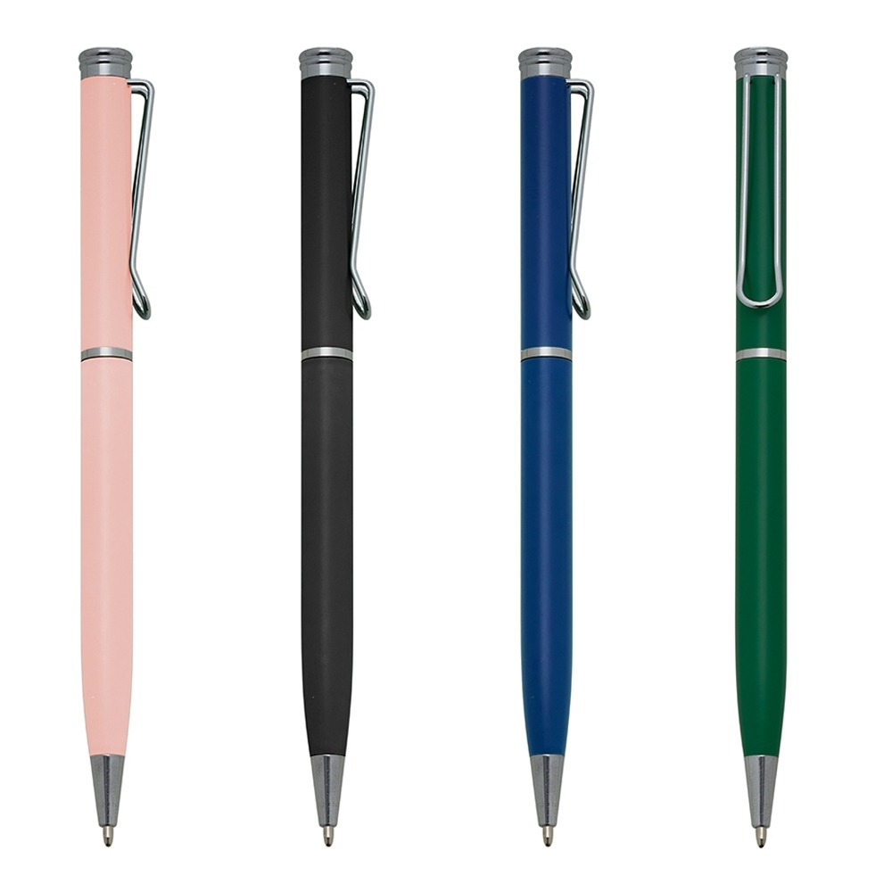 Caneta metálica com pintura fosca colorida e detalhes em prata. Clip metálico, acionamento por giro e carga esferográfica azul.
