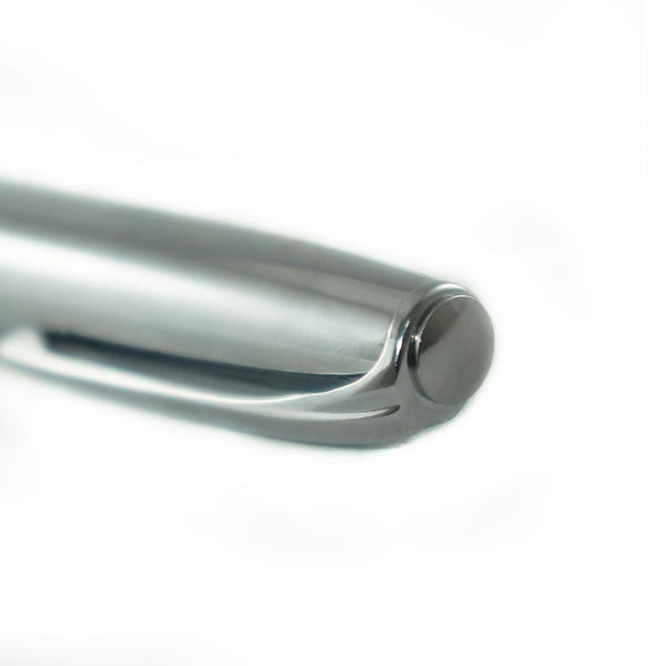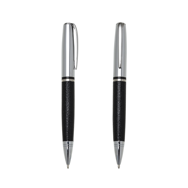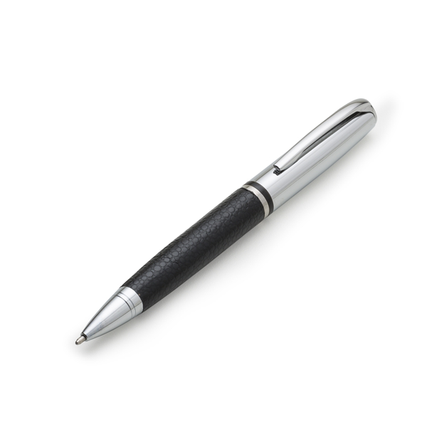 Descrição: Caneta metal prata com couro preto. Clip metal, possui anel central preto e dois anéis em relevo na ponteira. Possui as versões fosca e brilhante, aciona por giro.