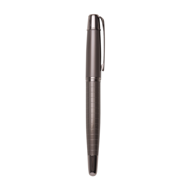 Descrição: Caneta roller metal na cor chumbo com detalhes quadriculados. Clip metal com centro e parte inferior da caneta brilhante. Para utilizar basta tirar a tampa.