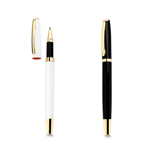 Descrição: Caneta metal roller com detalhes em dourado. Clip metálico, basta puxar a tampa para utilização.