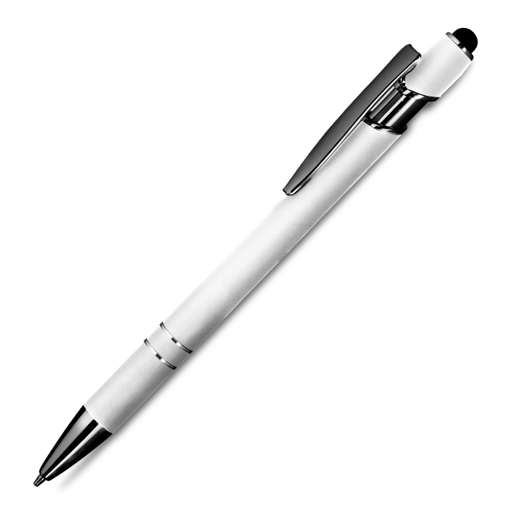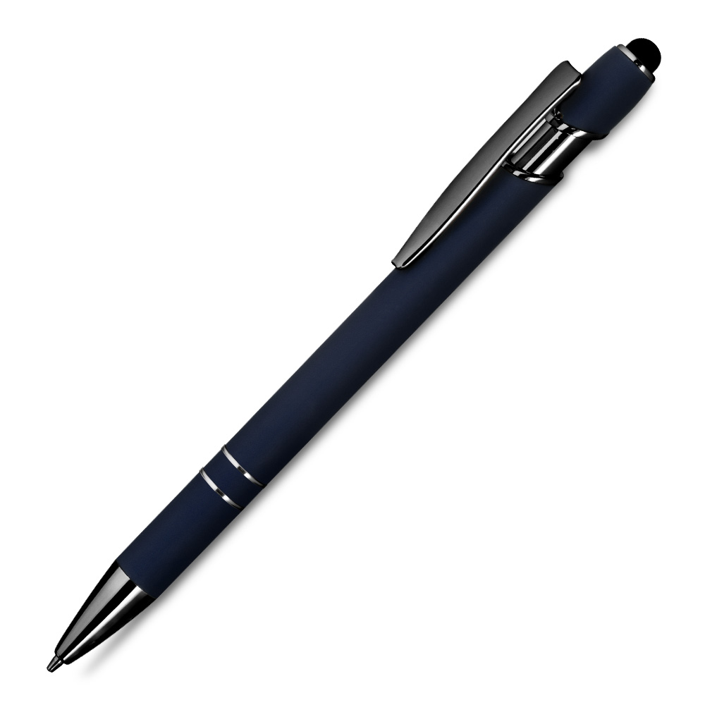 Caneta esferográfica em metal escrita em azul. Refil tipo parker com ponta touch emborrachada.