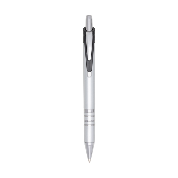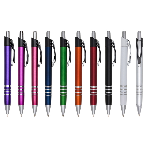 Descrição: Caneta plástica inteira colorida com detalhes prata. Possui clip de metal com detalhe plástico preto, parte inferior com três anéis coloridos. Aciona por clique.