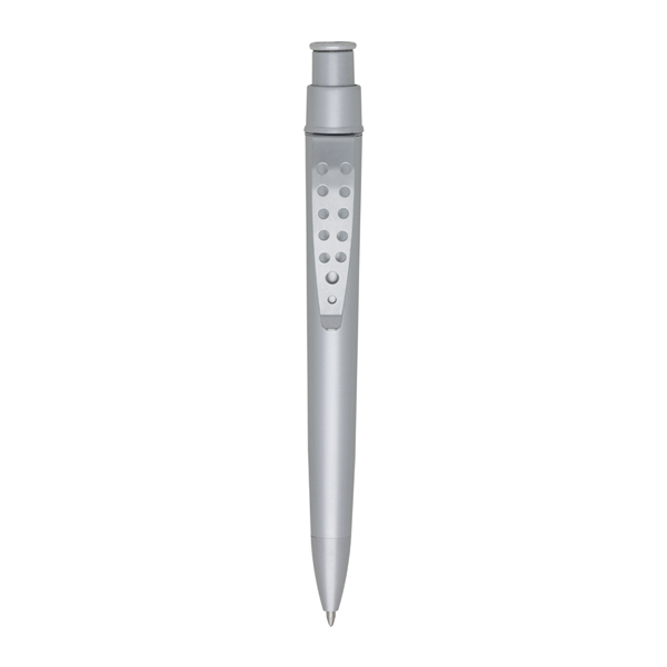 Descrição:Caneta plástica fosca inteira colorida com detalhes prata. Clip de metal com doze furos, aciona por clique..