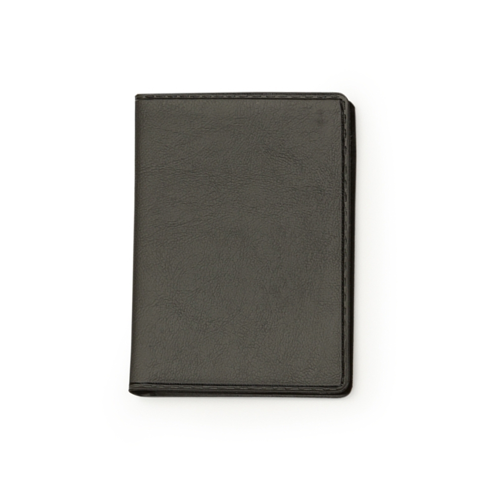 Carteira porta documento em couro sintético de frente e verso liso, parte interna com bolso plástico e duas divisórias para cartões.