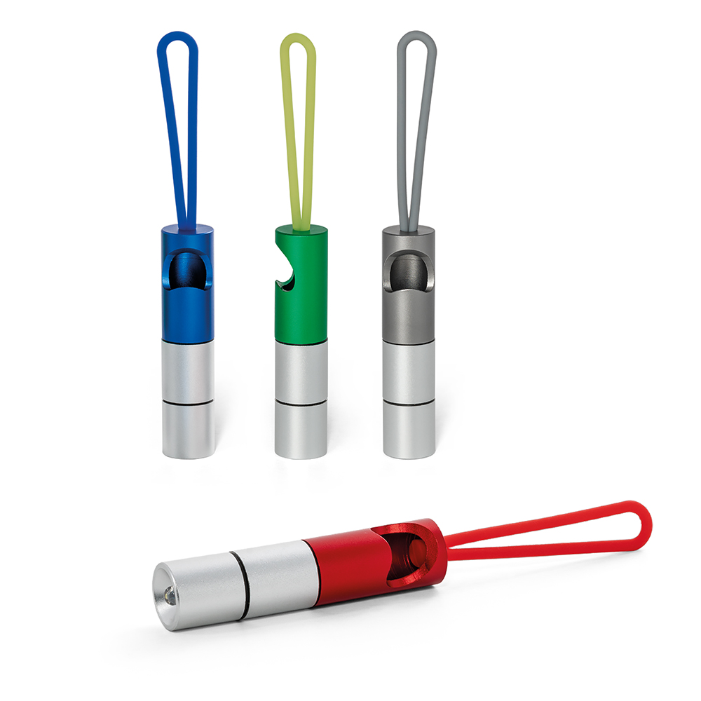 Descrição:MIRA Chaveiro Alumínio Com 1 LED Com abridor de garrafas e fita em silicone. Inclui 3 pilhas LR44. ø17 x 73 mm | Pega de silicone: 60 mm