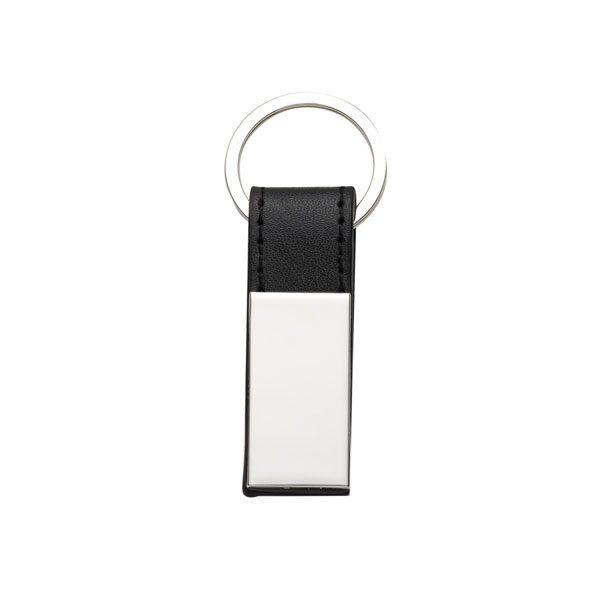 Chaveiro de metal com detalhe em couro sintético. Metal brilhante e liso de ambos lados.