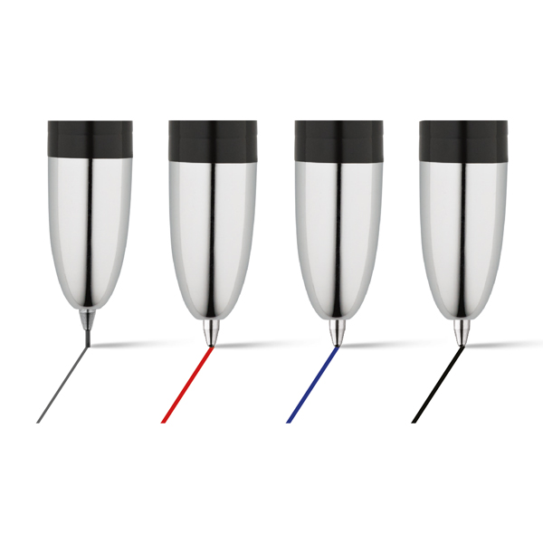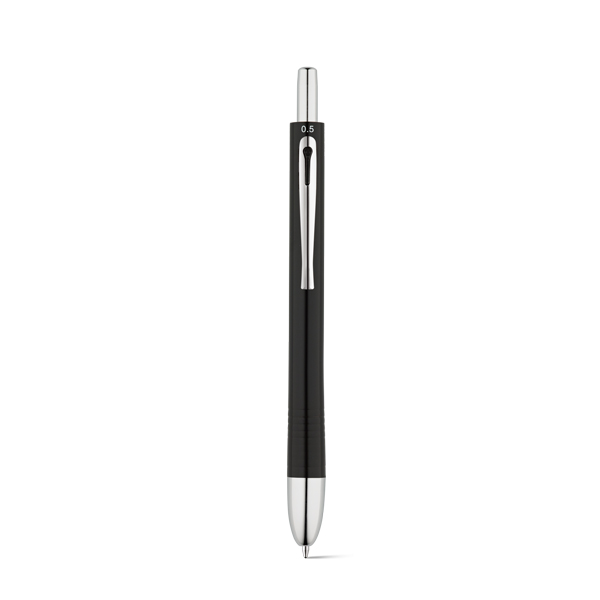Esferográfica e lapiseira. Metal. 4 em 1. Esferográfica: 2km de escrita (total). Lapiseira: grafite 0.5. Em estojo almofadado.