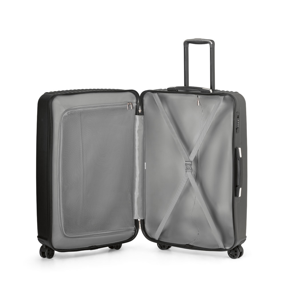 Descrição:Conjunto de 2 malas de executivo. ABS e PET. Interior forrado, com divisória. 4 rodas duplas giratórias. Pega extensível em alumínio, com mola (altura pega estendida mala cabine: 530 mm, altura pega estendida mala grande: 335 mm). Fecho de segurança com senha. Placa metálica removível, para fácil gravação. Capacidade: 33 L e 90 L.