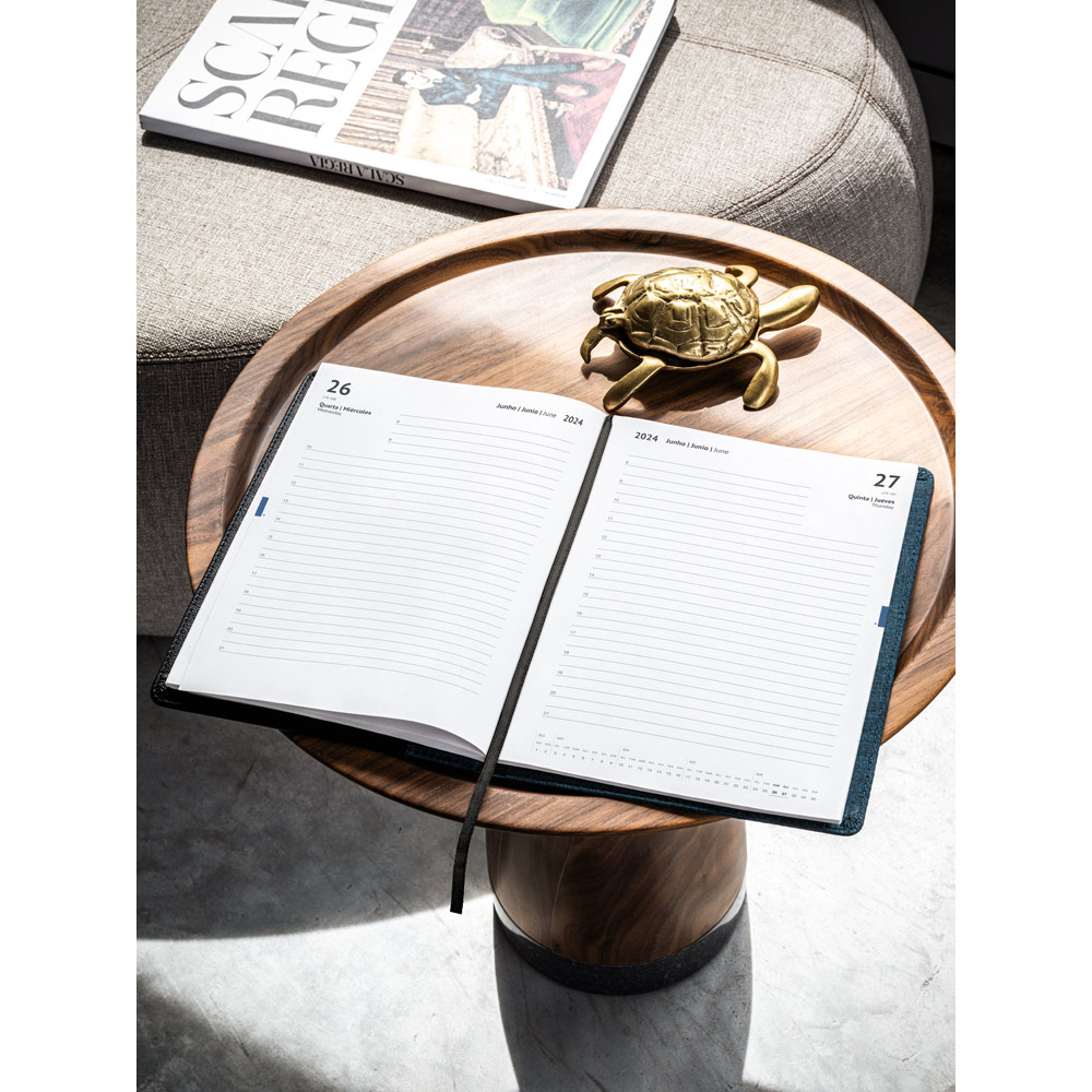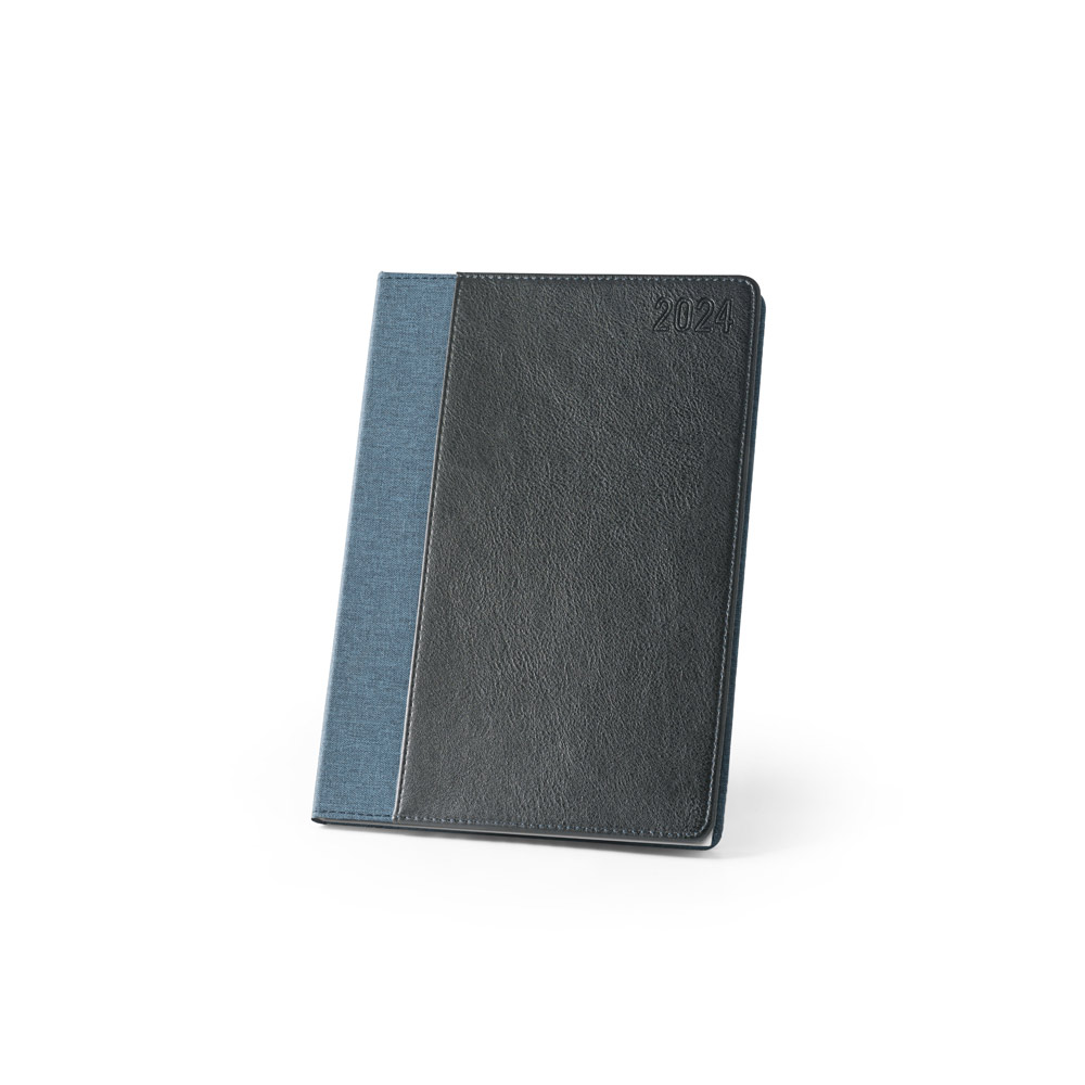 Agenda A5 com capa em rPET e PU reciclado. É organizada num plano diário, possui um bolso frontal ideal para guardar notas e outros documentos e marcador em fita. Fornecido com bolsa preta non-woven. 148 x 210 mm | Bolsa: 205 x 250 mm