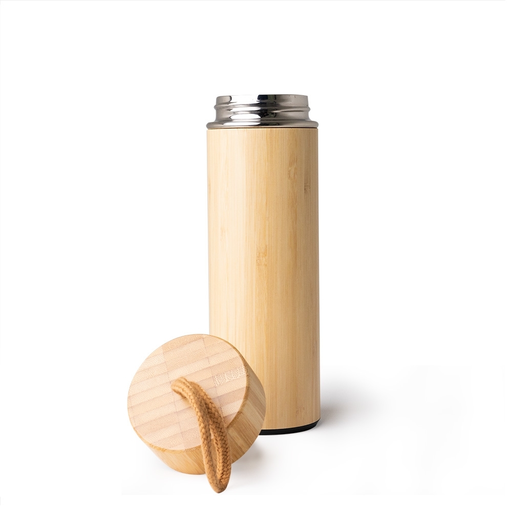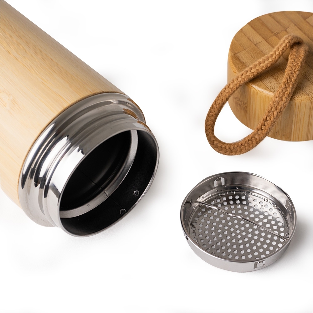 Descrição: Garrafa térmica de bambu e inox 400 ml e infusor de metal. Contém tampa rosqueável de bambu e alça de tecido embutida.