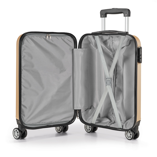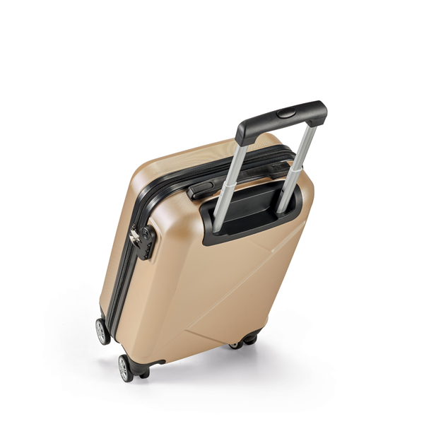 Mala de viagem executivo. ABS. Interior forrado, com divisória. 4 rodas duplas giratórias. Pega extensível em metal, com mola (altura pega estendida até 530 mm). Fecho de segurança com senha. Placa metálica removível, para fácil gravação.
