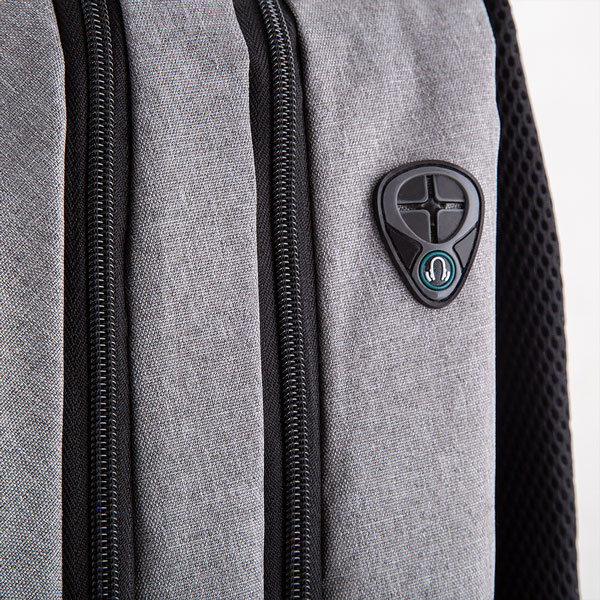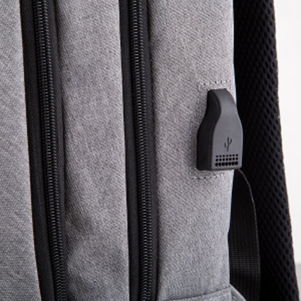 Uma mochila moderna com bastante espaço interno incluindo porta notebook, possui fechamento em cadeado com segredo. Alça de mão em metal, fita reflexiva, um bolso frontal grande. Divisórias internas para canetas, documentos e telefone celular. Alça almofadada. Saída USB e fone de ouvido. Tecido em poliéster.