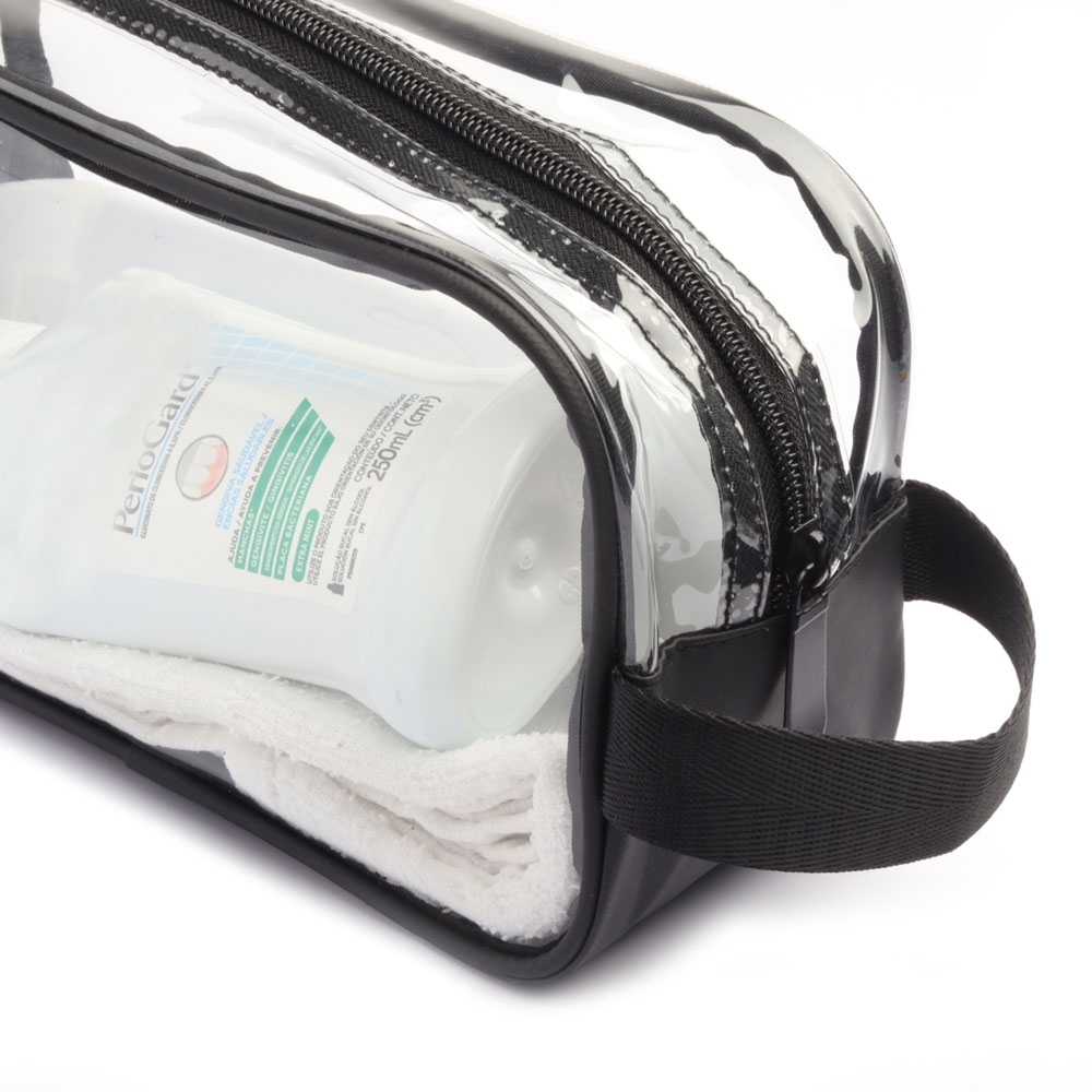 Descrição: Nécessaire em pvc com detalhe em poliéster.