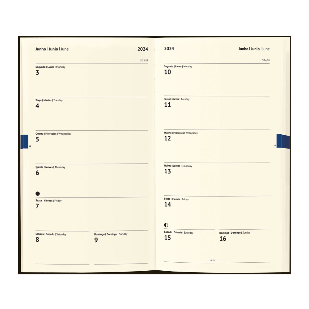 Agenda de bolso em cortiça com marcador em fita. Está organizada num plano bissemanal. 85 x 145 mm