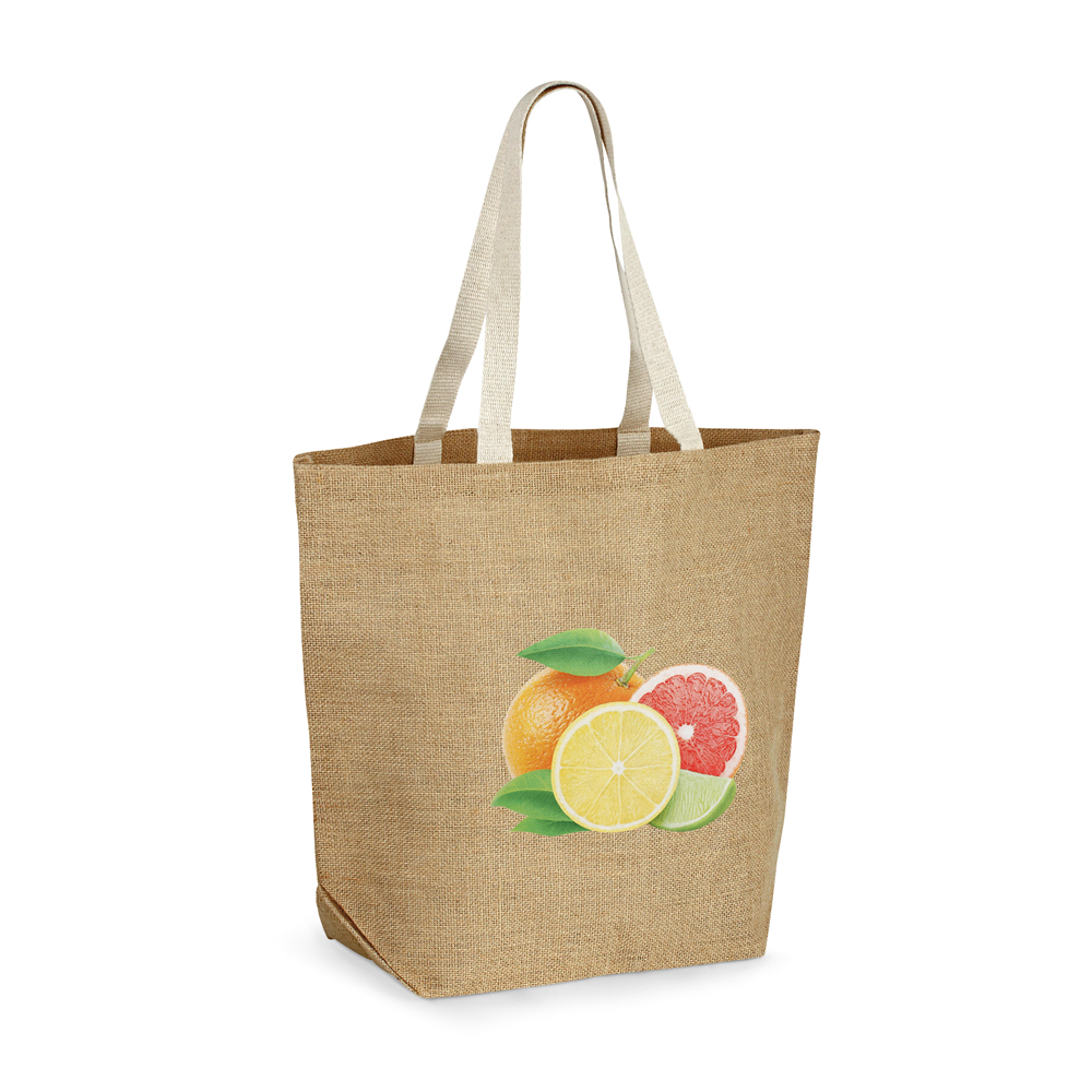 Descrição:TIZZY Sacola. Juta 360 g/m² Com laminado no interior. Alças webbing de 60 cm. 445 x 385 x 165 mm