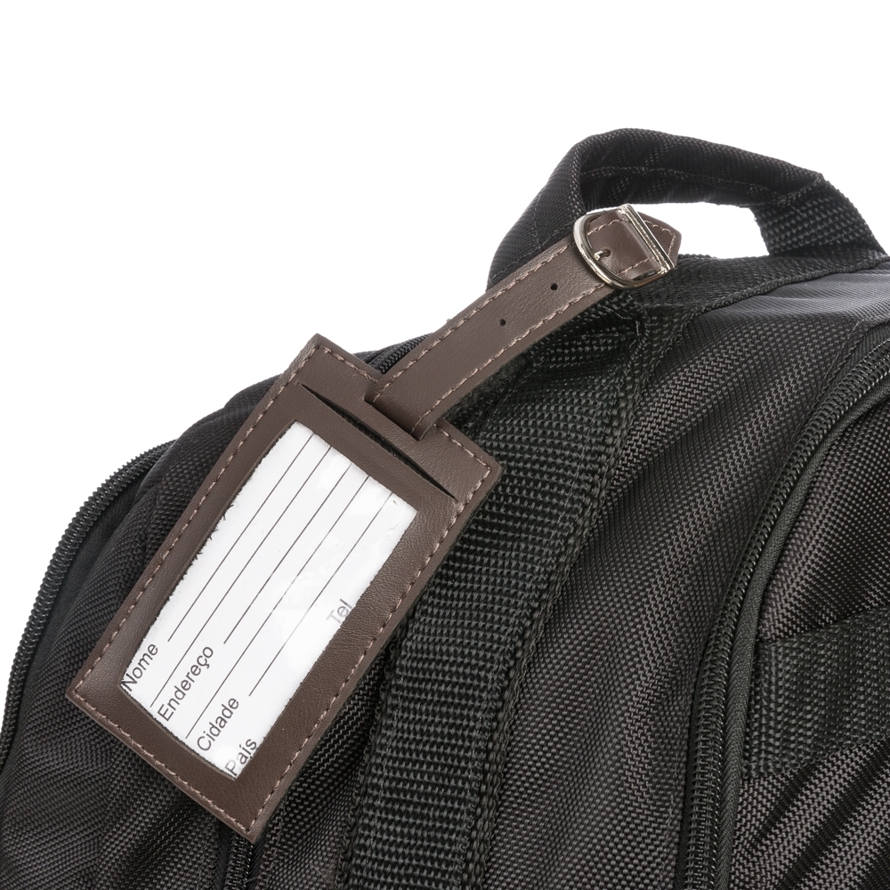 Tag identificador de bagagem de couro sintético. Parte frontal com bolso de visor plástico e lado inverso liso, possui fivela prata com 3 tamanhos de encaixe.